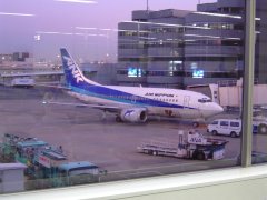 搭乗手続きを済ませて通路を歩いていくと、地平線の向こうに丸いものが。どうやら6:05に月の入りとなる月のようです。写真のタイムスタンプは6:34で、日の出は 6:39ですから、まだ夜明け前です。